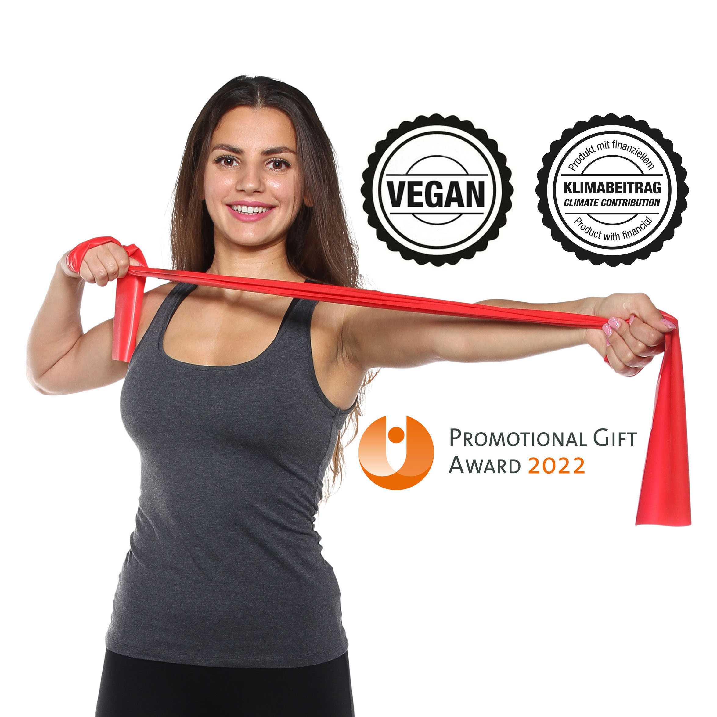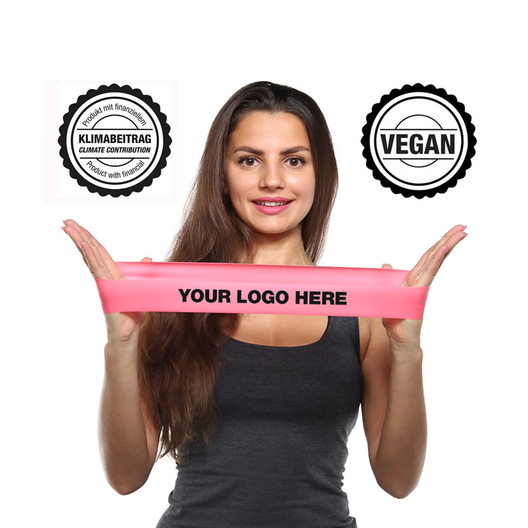 Dieses "Fitnessstudio im Taschenformat" ist der ideale Träger Ihrer Werbebotschaft - klein, leicht, mailingfähig und dabei absolut preiswert. Ideal für Pharma, Krankenkassen, Hotel, Tourismus, Onpack, Mailings. Bei niedrigen Stückzahlen und wenn die Farben Gelb, Rot, Limettengrün, Orange oder Blau "passen", bietet sich dieses hochwertiges Band "Made in Malaysia" an. Die Bandfarben Gelb, Rot und Grün verfügen über einen mittleren Widerstandswert, Orange ist etwas leichter, Blau ist etwas stärker. Wir bevorraten diese Bänder in unserem Lager normalerweise in hohen Stückzahlen und können somit schnell und flexibel auf Ihre Anfrage reagieren. Diese Bänder sind 1,5m lang und völlig unbedruckt. Logodruck 1c schon ab 400 Stück realisierbar. Diese Bänder sind strikt VEGAN (gelistet bei der Tierrechtsorganisation PETA) und enthalten weder Stoffe tierischen Ursprungs noch werden solche bei der Produktion eingesetzt. In Zusammenarbeit mit ClimatePartner haben wir für alle unsere Bänder die CO2-Emissionen berechnet. Wir führen den Ausgleich der Treibhausgase durch und dürfen deshalb unsere Bänder als PRODUKTE MIT FINANZIELLEM KLIMABEITRAG anbieten. Bei den Bändern handelt es sich um ein Geschenk der Natur, da sie überwiegend (> 95%) aus Naturlatex bestehen. Dies ist ein nachwachsender Rohstoff der schonend von Latexbäumen gewonnen wird, ohne diese zu zerstören. Hiermit ist er eine ressourcenschonende Alternative zu erdölbasierten Elastomeren. Unsere Bänder enthalten weder PVC noch Weichmacher. Bei der Herstellung werden weder AZO-haltige Farben noch blei-, cadmium- oder quecksilberhaltige Additive verwendet. Vielfältige Veredelungsmethoden wie Bedruckung, Verpackung z.B. im wiederverschließbaren Polybag, sowie neutrale Anleitungen und kundenspezifisch gestaltete Anleitungen mit Logoanbringung und individueller Titelseitengestaltung sind möglich.